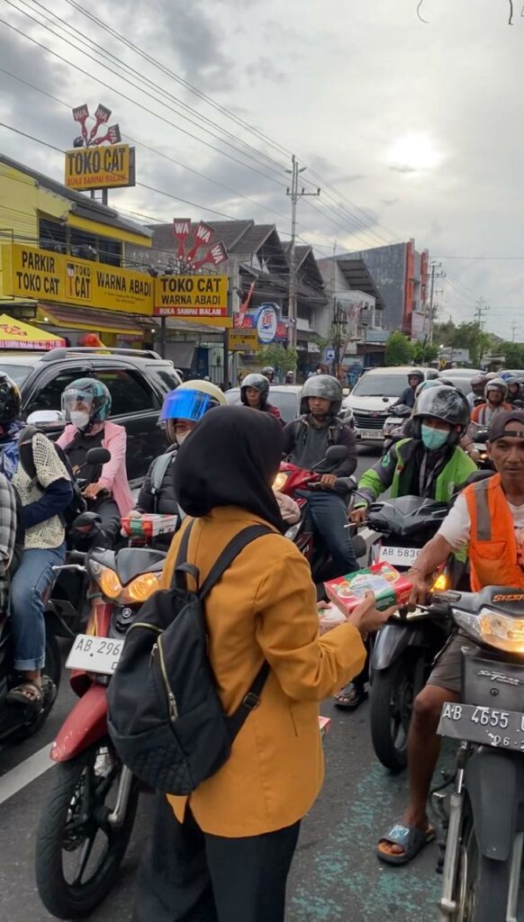 Sebanyak 600 paket takjil dibagikan kepada para pengendara dan pejalan kaki yang melintas di kawasan Pertigaan Tungkak, Yogyakarta. Kegiatan yang dimulai sekitar pukul 16.30 WIB tersebut berlangsung tertib meskipun kondisi lalu lintas cukup padat oleh masyarakat yang pulang dari aktivitas kerja.