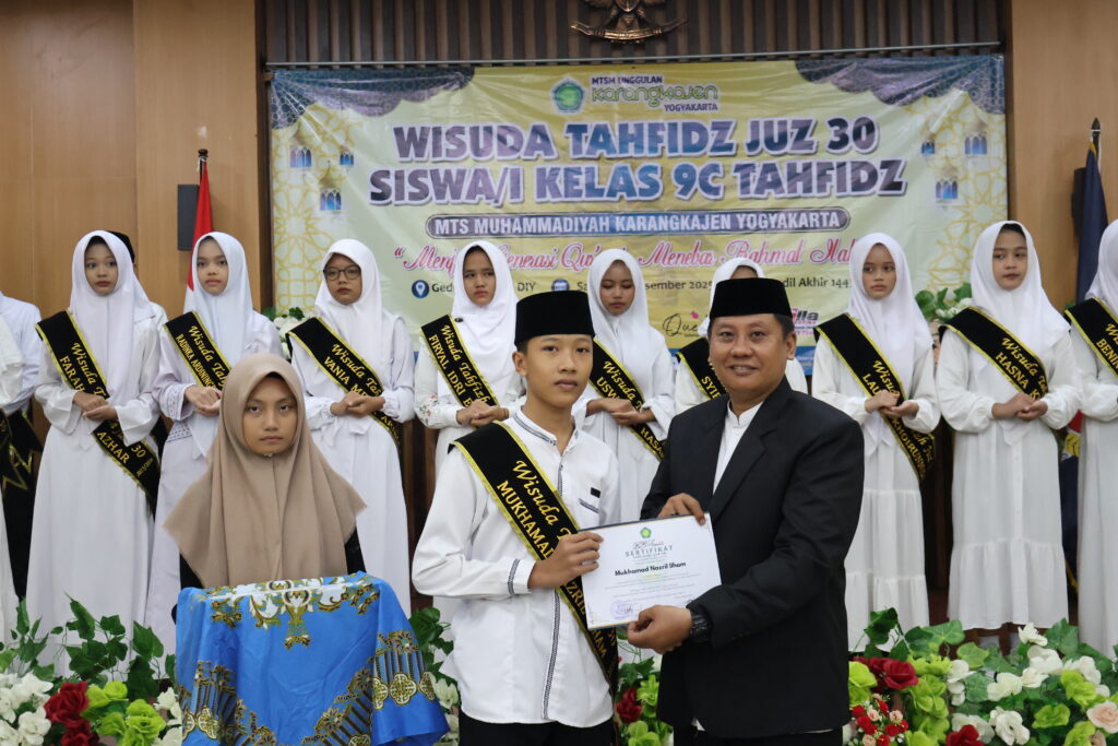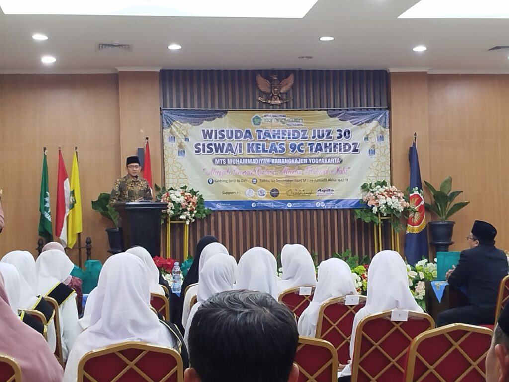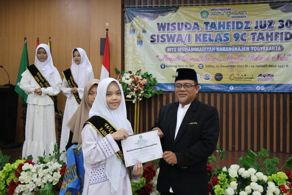 Yogyakarta — MTs Muhammadiyah Karangkajen Yogyakarta sukses menyelenggarakan Wisuda Tahfidz Juz 30 bagi siswa-siswi Kelas 9C Tahfidz pada Sabtu, 20 Desember 2025. Kegiatan ini berlangsung khidmat di Gedung DPD RI Kota Yogyakarta dan dihadiri oleh orang tua, tamu undangan, serta tokoh persyarikatan.